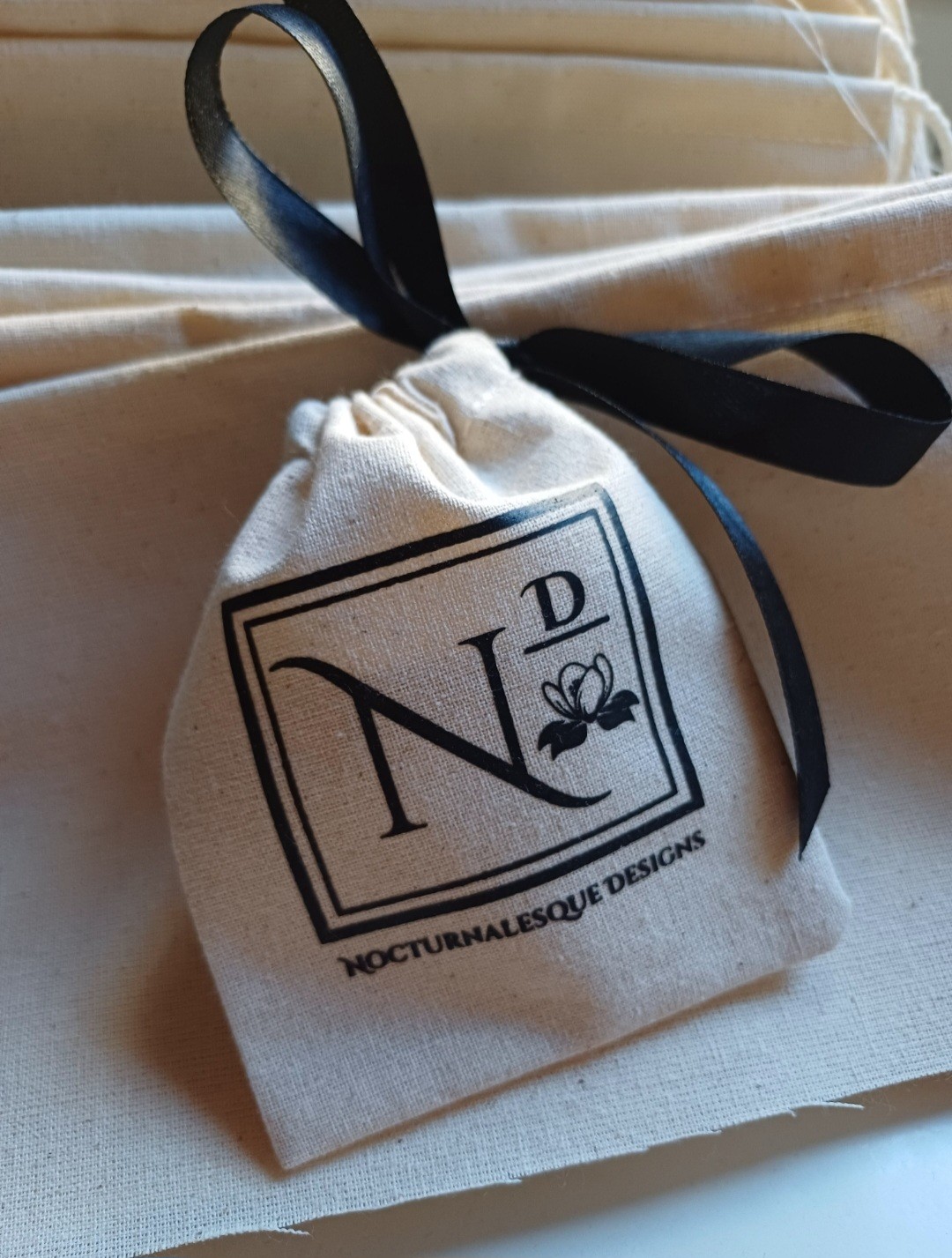 Pack 100 bolsas de algodón cinta satín personalizadas.